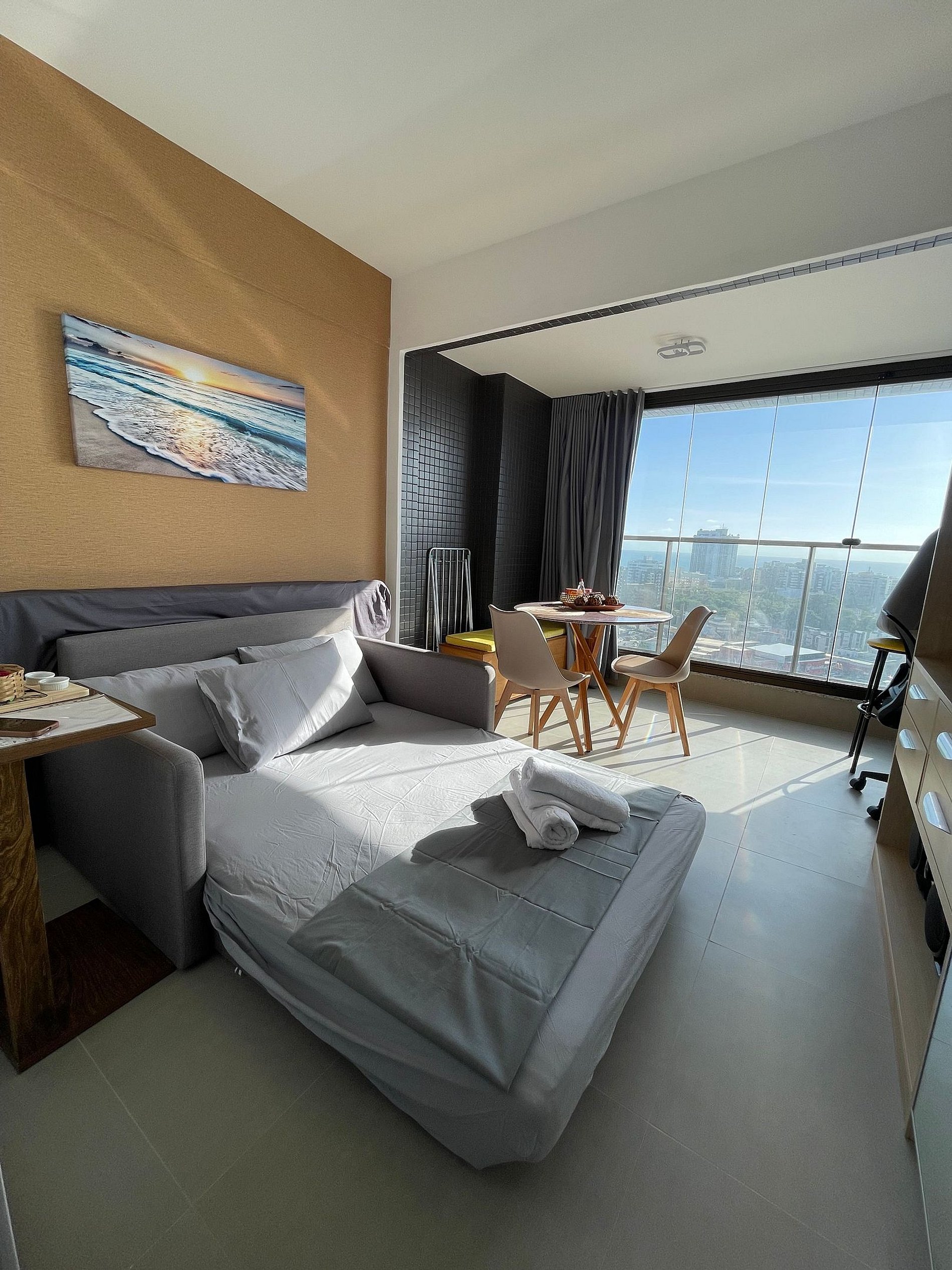 Unidade bem decorada com estrutura de ótimo padrão. Portaria 24 h, garagem, cooworking, lavanderia, mini mercado, área gourmet, solário, piscina com borda infinita, academia e uma vista cinematográfica para o mar.